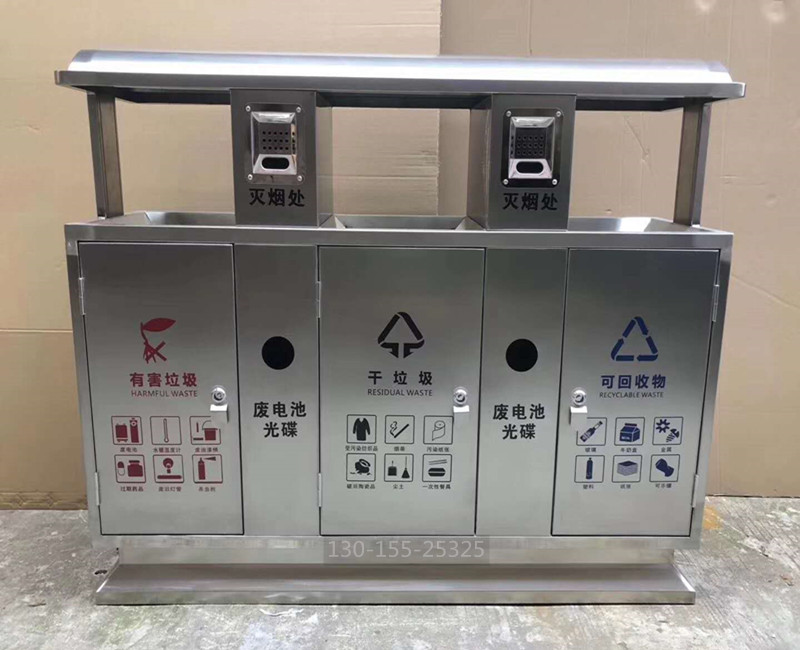 分類垃圾桶整體采用優質冷軋鋼板加工而成,表面經過除油、噴砂防銹處理后,再進行酸洗磷化處理;表面清理干燥后整體進行靜電噴涂或烤漆處理,靜電噴涂是經過流水線高溫固化爐固化后再出爐冷卻,加工后的塑粉附著力強,不易剝落。